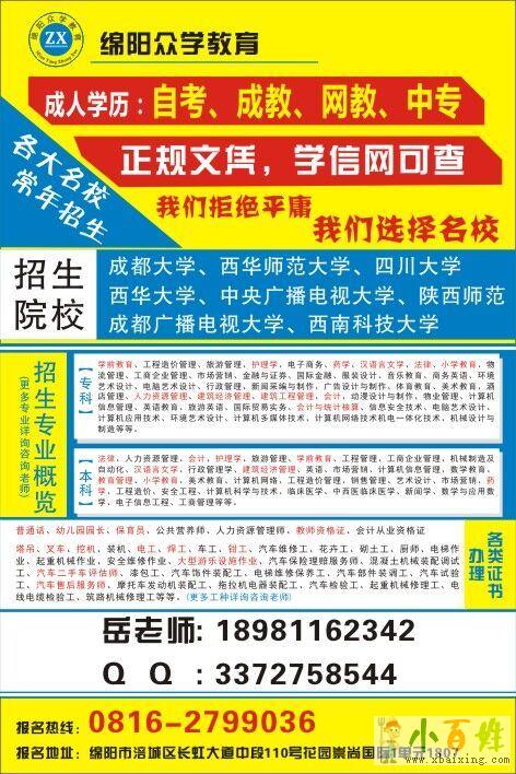 绵阳众学教育主要从事成人学历(自考、成教、网教、电大、中专),职业资格证,特种工操作证,职称等业务。公司业务涵盖面较为广泛,欢迎来电咨询或实地考察